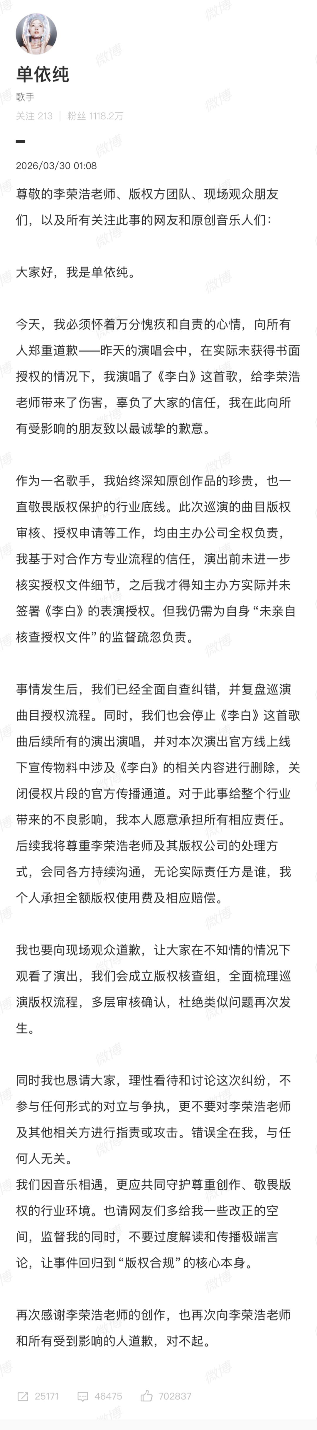 紧接着,单依纯本人也在凌晨发布了长文道歉。态度倒是放得很低,承认了自己“未亲自核查授权文件”的疏忽,承诺停止演唱、删除物料,并表示“无论实际责任方是谁,我个人承担全额版权使用费及相应赔偿。”