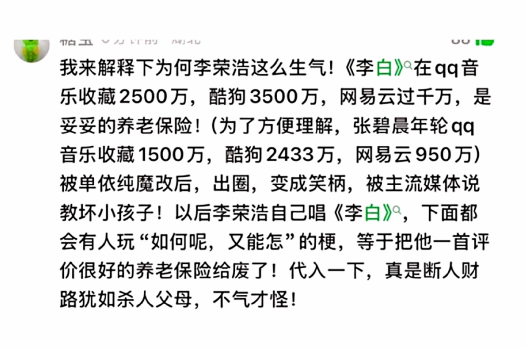 很多理智网友看得很透彻。有人解释了李荣浩为什么这么生气:因为《李白》是他的“养老保险”啊!