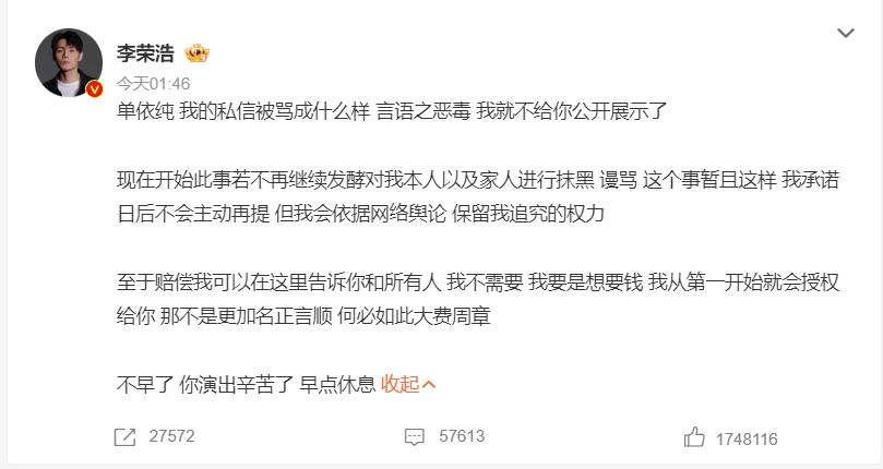 你以为道歉了就完事了?天真!饭圈的战斗力永远超乎你的想象。李荣浩维权后,私信惨遭单依纯部分极端粉丝的恶毒谩骂。逼得李荣浩再次发文(甚至发了私信截图)。