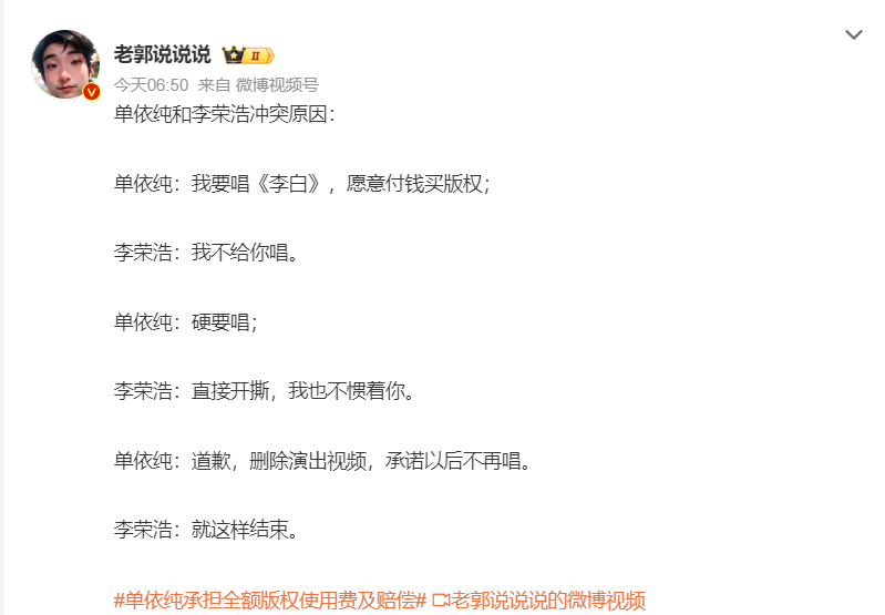 没错,单依纯在深圳演唱会上想唱《李白》,甚至愿意付版权费。但李荣浩方明确且客气地婉拒了。结果呢?单依纯方头铁,在没有拿到授权的情况下,硬是把歌给唱了。这波操作,直接把李荣浩给惹毛了。
