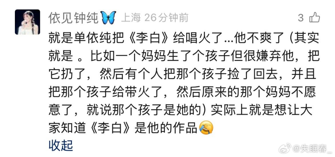 最离谱的是出现了一个“生母与养母”的神比喻。有粉丝说:“就像一个妈妈生了孩子嫌弃扔了,另一个人捡回去带火了,原妈妈就不愿意了。” ——博主我看到这里满头问号,李荣浩的《李白》早就火遍大江南北了好吗?需要别人来带火?这比喻简直是给自家偶像招黑啊!