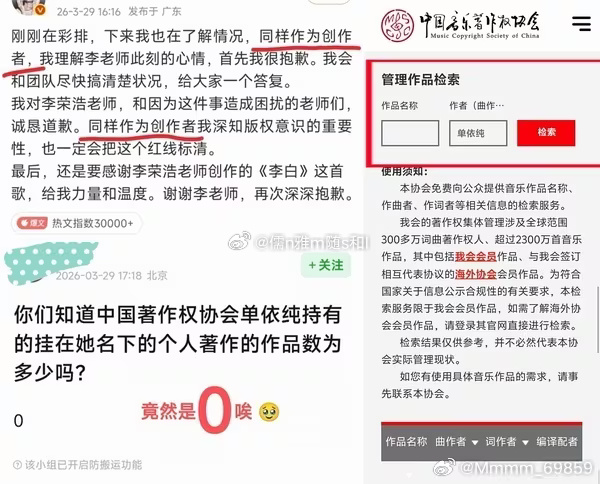 网友查询音著协,单依纯原创作品为0
