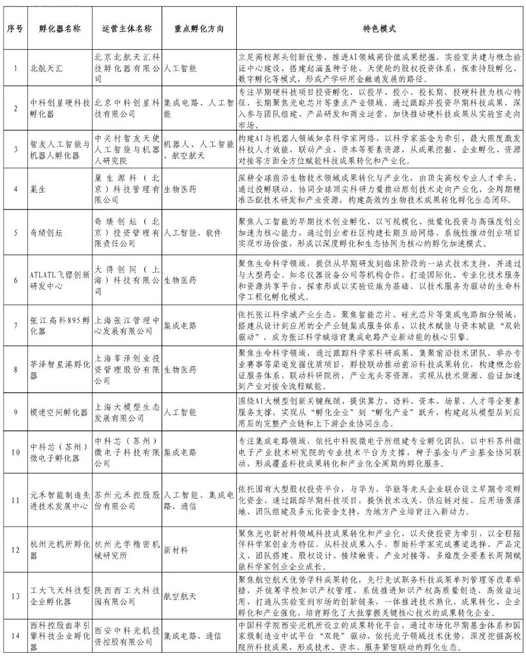 在官方公示的第一批名单中,全国仅有14家孵化器入选卓越级(标准级403家)。这14家孵化器是:北航天汇、中科创星硬科技孵化器、智友人工智能与机器人孵化器、巢生、奇绩创坛、ATLATL飞镖创新研发中心、张江高科895孵化器、莘泽智星港孵化器、模速空间孵化器、中科芯(苏州)微电子孵化器、元禾智能制造先进技术发展中心、杭州光机所孵化器、工大飞天科技型企业孵化器、西科控股曲率引擎科技企业孵化器。