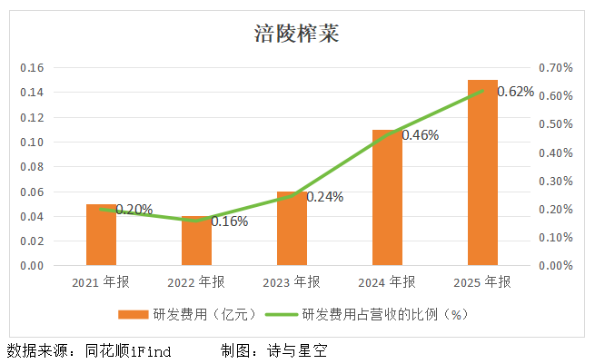 销售费用大幅增长的同时,全年研发费用达1535.52万元,同比增长44.58%,主要用于新品研发,如脆口榨菜芯、老重庆杂酱等产品,以及生产工艺优化和原料技术升级。