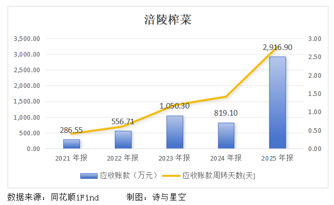 此外,全年应收账款2916.9万元,同比大增256.11%,创历史新高。公司解释为新增3名直销客户,货款受账期影响暂未收回,但本质是为拓展餐饮、商超等直销渠道,放宽信用政策所致。
