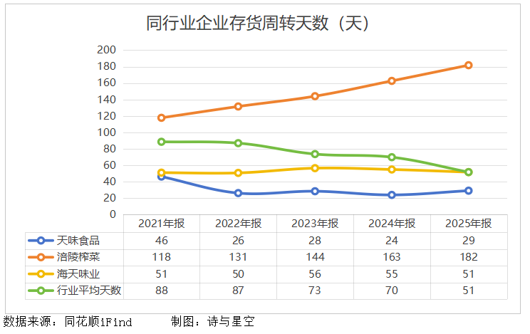 公司存货周转连续四年下滑,去化压力凸显。2025年公司存货周转天数达182天,创历史新高,较2024年的163天、2023年的144天持续攀升,远低于海天味业51天、天味食品29天等快消品同行。