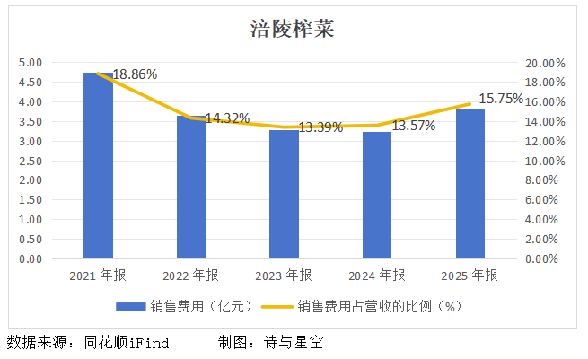 2025年公司销售费用达3.83亿元,同比增长18.21%,销售费用占营收的比例从2024年的13.57%升至15.75%,提升2.2个百分点。