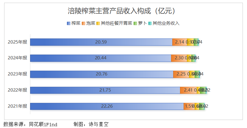 在产品端,核心品类榨菜增长乏力,营收依赖度居高不下。作为绝对支柱,榨菜业务全年营收20.59亿元,同比仅微增0.74%,占总营收比重高达84.69%,毛利率提升1.24个百分点至55.79%,基本盘依然稳固,但增长动能明显不足。