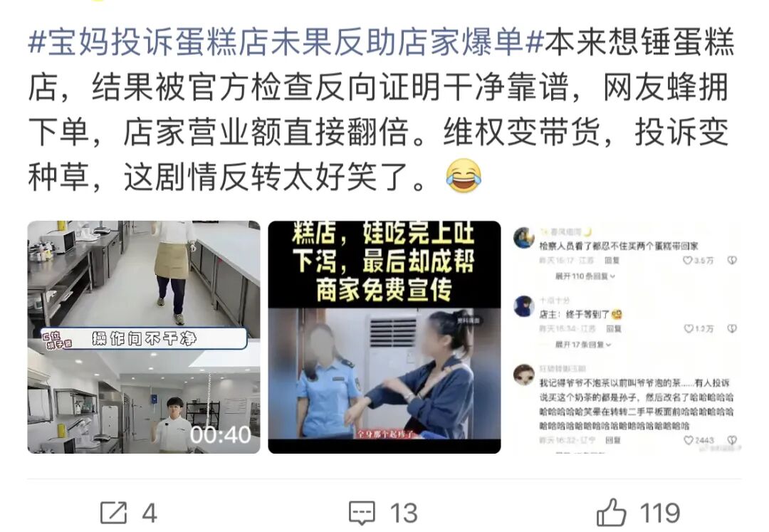 还有网友则表示:「本来想锤蛋糕店,结果被官方检查反向证明干净靠谱,网友蜂拥下单,店家营业额直接翻倍。维权变带货,投诉变种草,这剧情反转太好笑了」