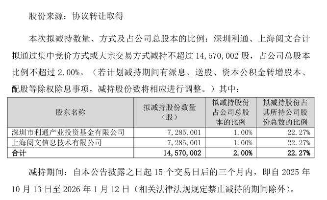 2025年9月12日,中文在线在深交所发布关于大股东股份减持计划预披露的公告。公告显示,腾讯系关联股东深圳市利通产业投资基金有限公司(以下简称“深圳利通”)、上海阅文信息技术有限公司(以下简称“上海阅文”)计划自本公告披露之日起15个交易日后的三个月内以集中竞价方式或大宗交易方式合计减持公司约1457.00万股,拟减持股份占公司总股本比例的2%。