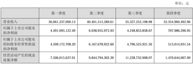 更令人关注的是,公司季度业绩在年内出现了剧烈波动。一季度归母净利润44.91亿元,二季度攀升至60.39亿元,三季度回落至42.49亿元,四季度骤降至7.08亿元。第四季度归母净利润较三季度缩水超八成,较二季度下滑近九成,盈利韧性显著走弱。