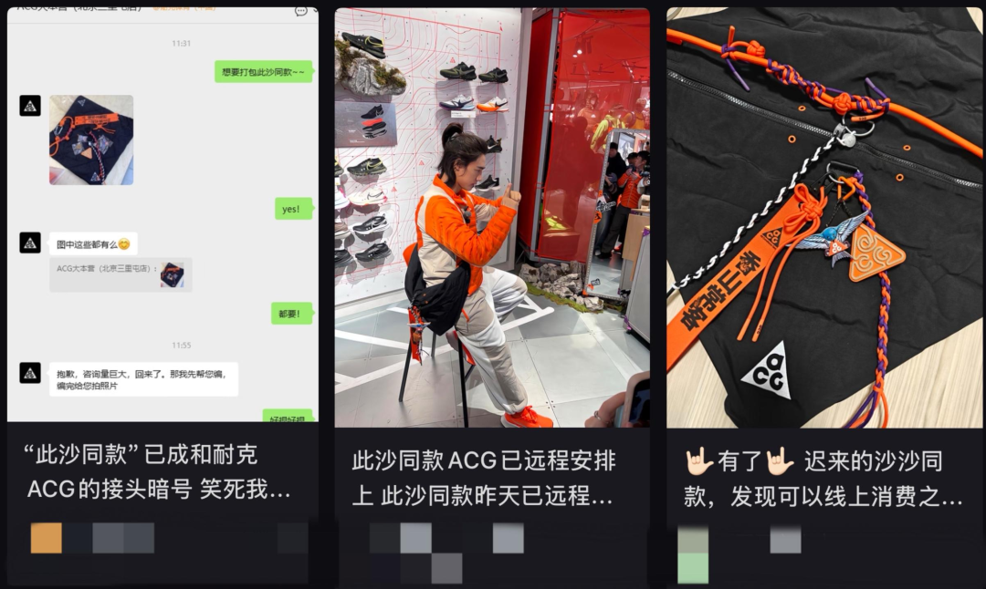 同样,基于专业运动场景的投入开始激发消费者需求。2月底,ACG全球首店落地北京,通过沉浸式空间设计与社群互动强化体验感。例如,围绕演员此沙的同款内容,在社媒形成传播热点,门店提供同款挂绳的个性化编织服务,情绪价值拉满。此外,ACG门店展陈突出真实野外场景,有助于消费者直观理解产品功能并感知品牌细节,增强与品牌的情感绑定。