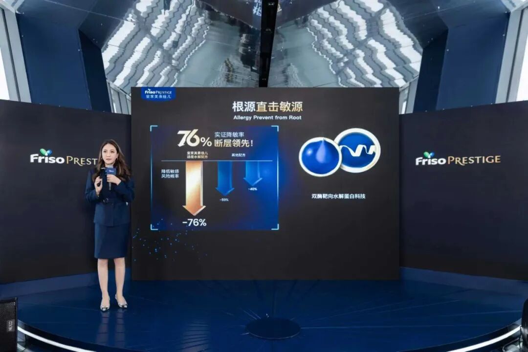 菲仕兰在发布会上介绍了该配方的独特优势,产品采用双酶靶向水解蛋白技术,精准切割牛奶蛋白中的致敏片段,同时尽可能保留营养成分。此外,配方中还添加了益生菌HN001和BB12,以及4倍⁷母源级2'-FL型HMO与GOS益生元的组合。这一配方设计着眼于从多维度支持婴幼儿免疫系统的健康发展。
