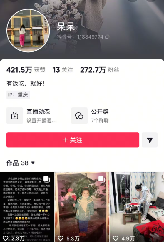 互联网造神到底有多牛,大概柴油们在今年年初见识到了,那就是年初因为摇人按猪的重庆合川呆呆——喊网友杀猪博主数天涨粉160万!直播间10万人成常态,20秒视频报价近千……其作为一个素人账号,发布了一条制作十分粗糙的视频,配上一段简短的文案,快速吸引几十万的点赞,短时间揽获两百万粉丝。