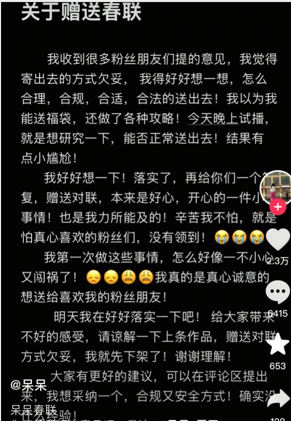 随后,她提供了三个活动方案供粉丝选择:一、她免费送一对春联和一张福字,全是亲手写,包邮,但是名额有限1000份;二、超过1000份后的春联邮费寄到付;三、邮费由自己承担,春联她自己买,开直播写对联。她同时还强调:“如果想要的人很多,春联的总量定在1万份。”随后,其还开直播谈到了送春联的事,超10万网友同时涌进直播间。然而,很快呆呆撤掉了赠送春联的计划,并发视频解释称,觉得寄出去的方式欠妥,需要好好想想怎么合理、合规、合适、合法的送出去。