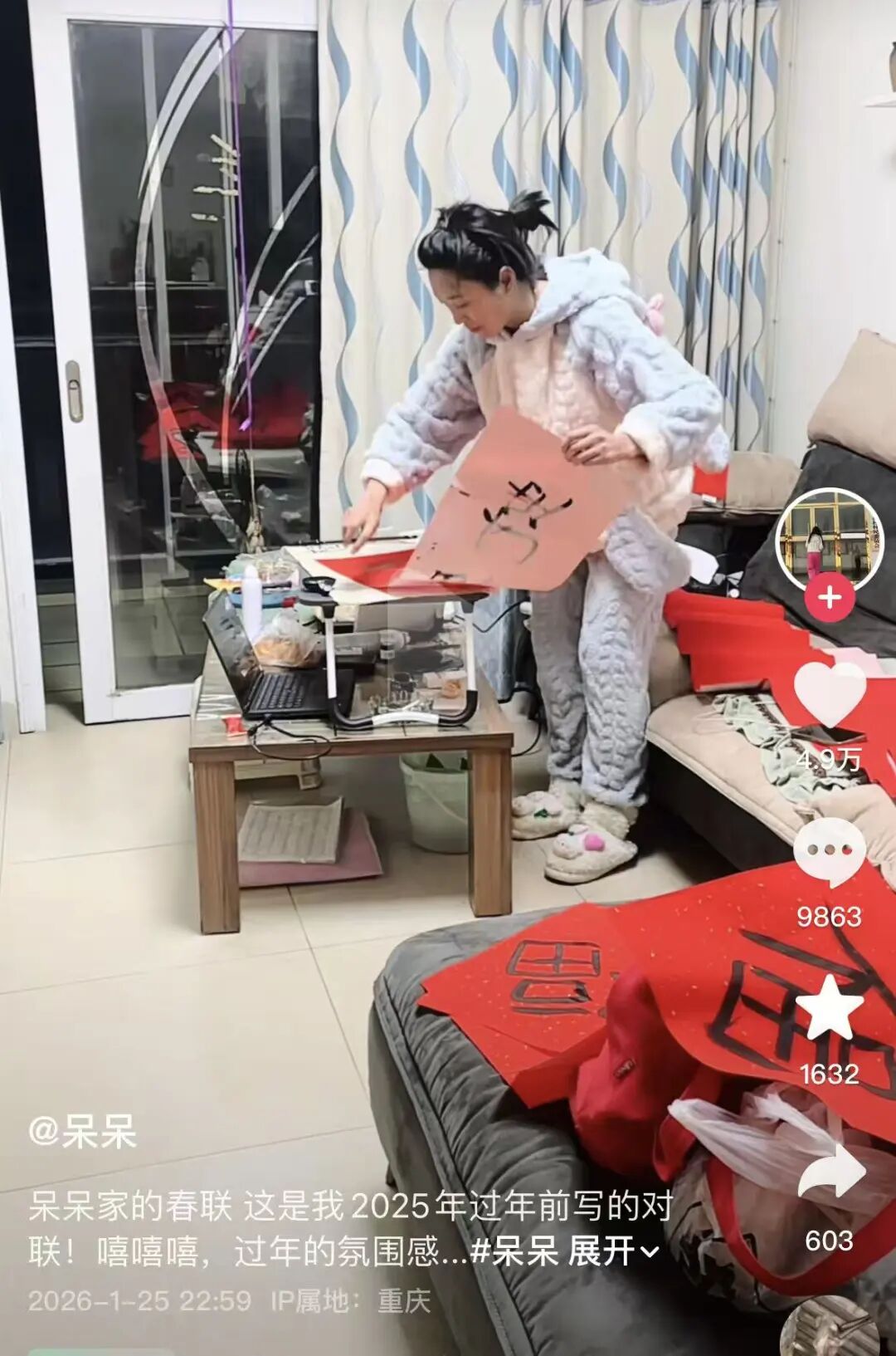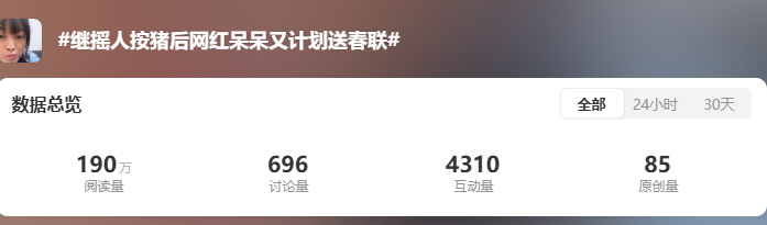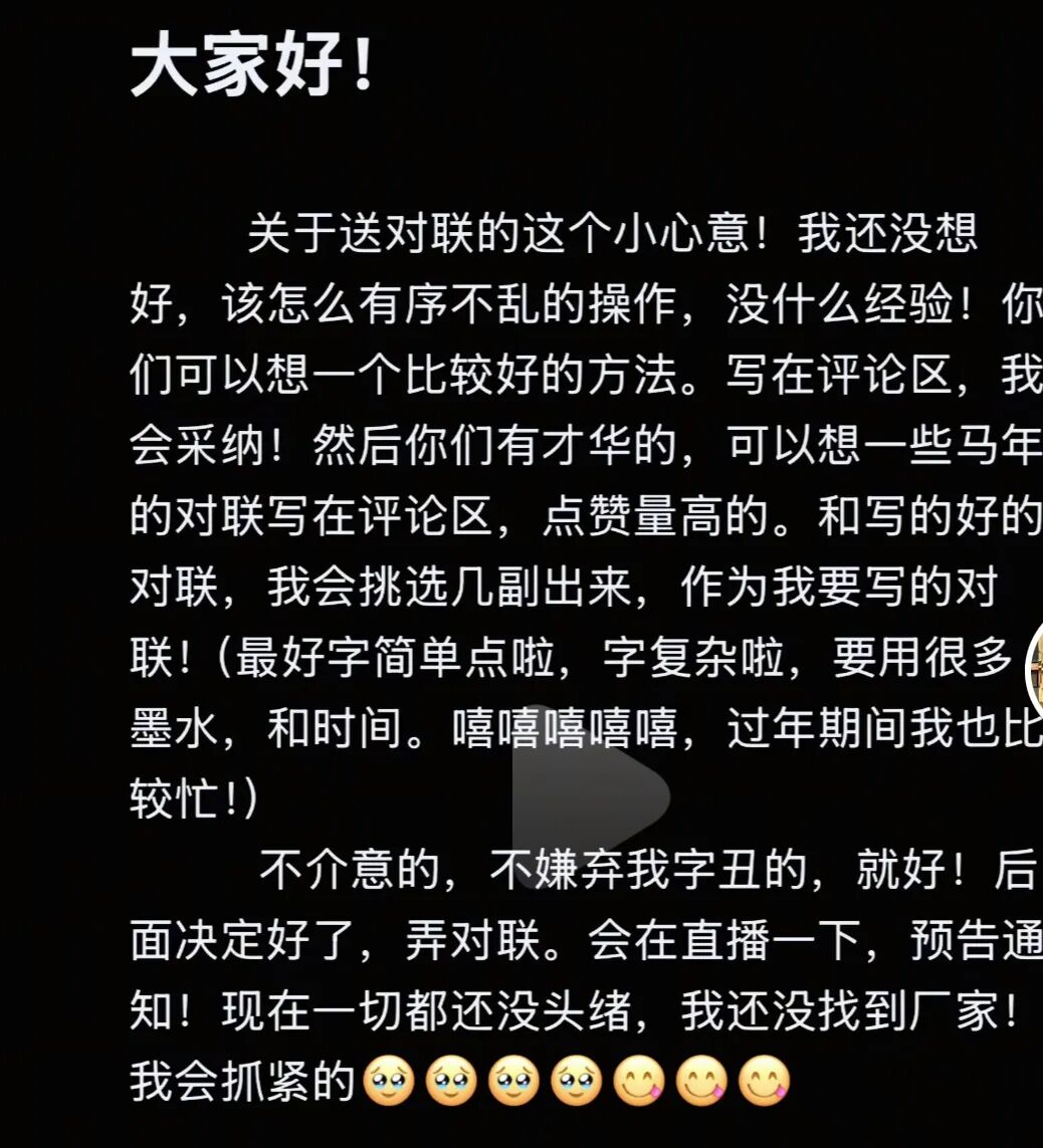 不过,呆呆最近又来搞事了!也就是在年猪基本上杀完后,呆呆又瞄准了春节这一热点——送春联。其在个人社交媒体账号宣布了一个重大决定,将给粉丝送自己亲手写的春联。