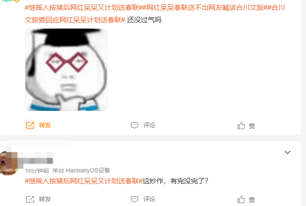 还有网友表示::“最好的方法,还是去找合川文旅,由官方印刷合川的景点、特色食品的小卡片,和你亲手写的春联放一起,这样也可以推广介绍合川。”对此,合川文旅工作人员表示,他们将向领导汇报此事。对于这件事,网友们也是吵翻了,有人表示,呆呆“流量向善”的真诚,回馈粉丝并没有错,也有人表示,万份承诺是炒作噱头,字迹实用性低,且依赖文旅介入可能消耗公共资源。