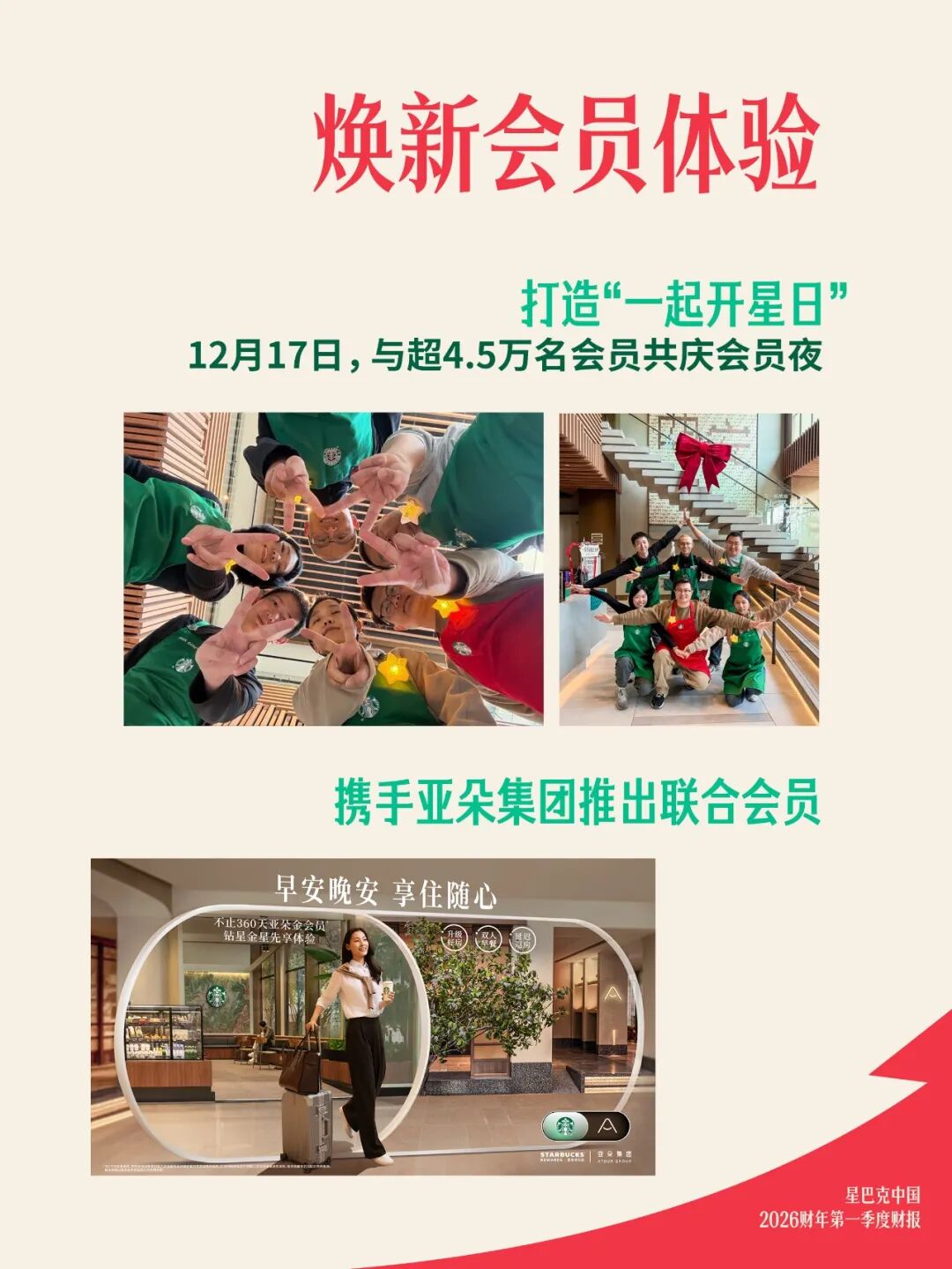 此外,星巴克会员权益焕新,覆盖多元生活场景。为提升会员粘性,星巴克星享俱乐部不断拓展 “星朋友圈”,继与希尔顿集团、中国东方航空推出联合会员计划之后,本季度又与亚朵集团达成合作,进一步丰富会员权益,覆盖出行交通、酒店住宿、机场 / 高铁贵宾休息室等方方面面。同时,自 2025 年 12 月起,星巴克将每月 17 日打造为星巴克会员的 “一起开星日”,通过开星膨胀、开星合拍、开星市集、开星竞拍四大趣味互动机制,为会员带来更有温度的 “星式生活” 体验。