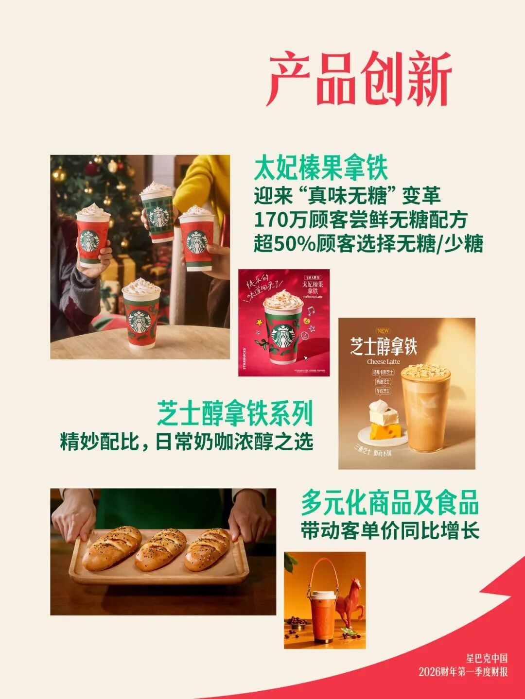 其中,产品创新精准锚定健康消费趋势。本季度,星巴克将颇受好评的 “真味无糖” 产品家族进一步扩容,纳入冬季标志性饮品太妃榛果系列,首次推出无糖与甜度可选的客制化选项,精准响应消费者对健康饮品的需求。