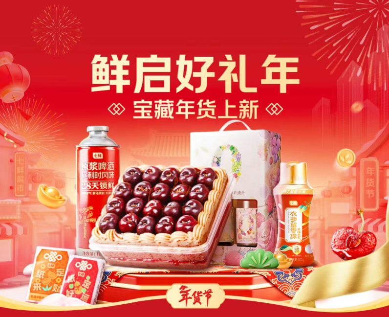 此外,门店在业态布局上持续创新。设立“配料干净”自有品牌专区,主打健康零食产品;北京店新增宠物用品专区,推出“一口纯净”系列宠物食品,进一步拓展服务范围。针对年货采购需求,店内特设“七鲜酒馆”专区,汇集飞天茅台、直采进口葡萄酒、京鲜舫白酒礼盒等全系酒品,满足消费者节日宴饮与馈赠需求。