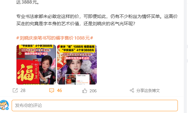 据了解,刘晓庆的字还真不便宜,单字"福"标价1088元、四字组合如"平安喜乐"定价3888-3999元。
