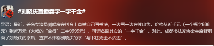 而这两条,一直活跃在社交媒体的老艺人刘晓庆,也开始现身直播间展纸挥毫,售卖个人书法作品,相关话题也是快速冲上热搜——刘晓庆直播卖字一字千金……