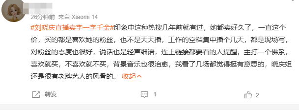 也有网友表示:印象中这种热搜几年前就有过,她都卖好久了,一直这个价,买的都是喜欢她的粉丝,也不是天天播,工作的空档集中播个几天,都是现场写,对粉丝的态度也很好,说话也是轻声细语,连上链接都要看的人提醒,主打一个佛系,喜欢就买,不喜欢就不买,背景音乐也很治愈,我看了几场都觉得挺有意思的,晓庆姐还是很有老牌艺人的风骨的。
