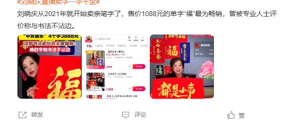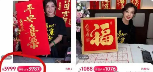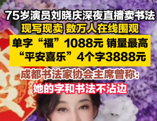 据了解,刘晓庆在直播间现场书写并售卖书法作品,主要产品包括单字"福"(1088元)、二字组合"好运"(999元)、四字吉语如"平安喜乐"或"紫气东来"(3888-3999元)。