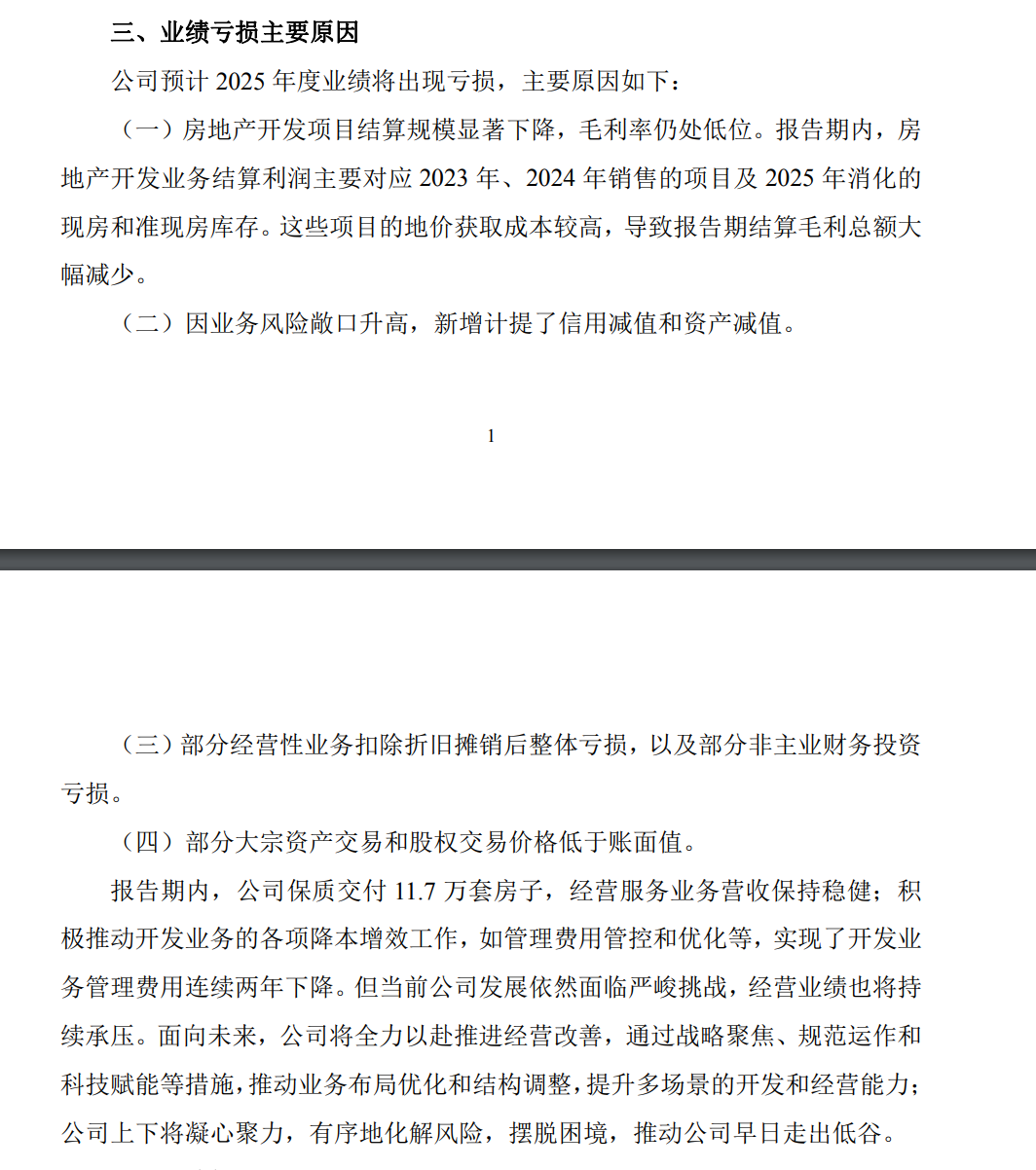 公告称报告期内,房地产开发业务结算利润主要对应2023年、2024年销售的项目及2025年消化的现房和准现房库存。这些项目的地价获取成本较高,导致报告期结算毛利总额大幅减少。万科表示2025年保质交付11.7万套房子,经营服务业务营收保持稳健;积极推动开发业务的各项降本增效工作,如管理费用管控和优化等,实现了开发业务管理费用连续两年下降。