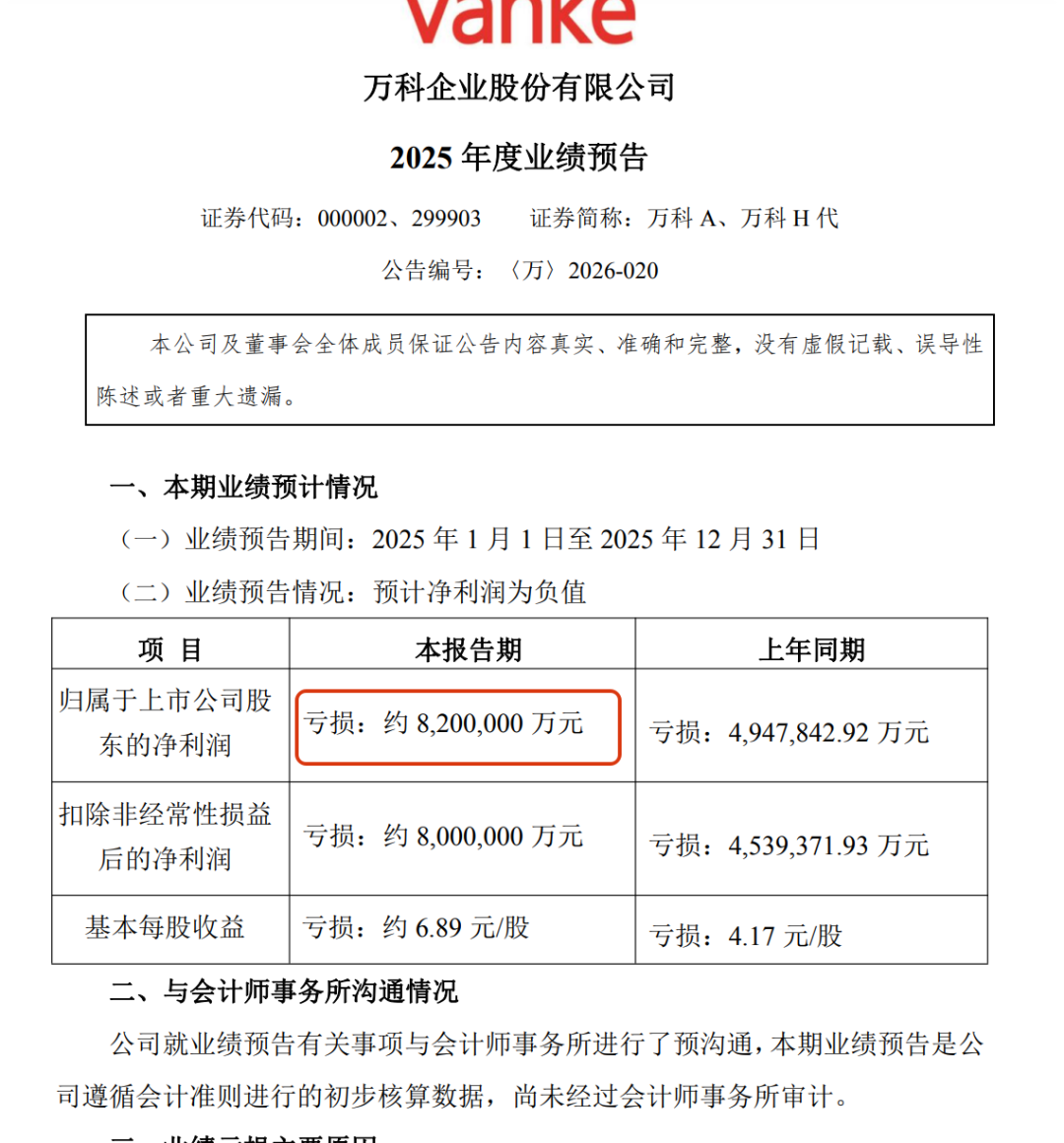 万科在业绩预告中,对2025年巨亏820亿元做出了解释,认为有四个方面原因导致的巨亏。分别是房地产开发项目结算规模显著下降,毛利率仍处低位、因业务风险敞口升高,新增计提了信用减值和资产减值、部分经营性业务扣除折旧摊销后整体亏损,以及部分非主业财务投资亏损和部分大宗资产交易和股权交易价格低于账面值。