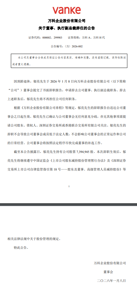 根据最新报道信息,万科原董事长郁亮突然更新动态,在2026年1月28日左右给一个长隆野生动物园的视频点了“在看”,这是他自退休后的首次公开动态,引发了市场广泛关注。