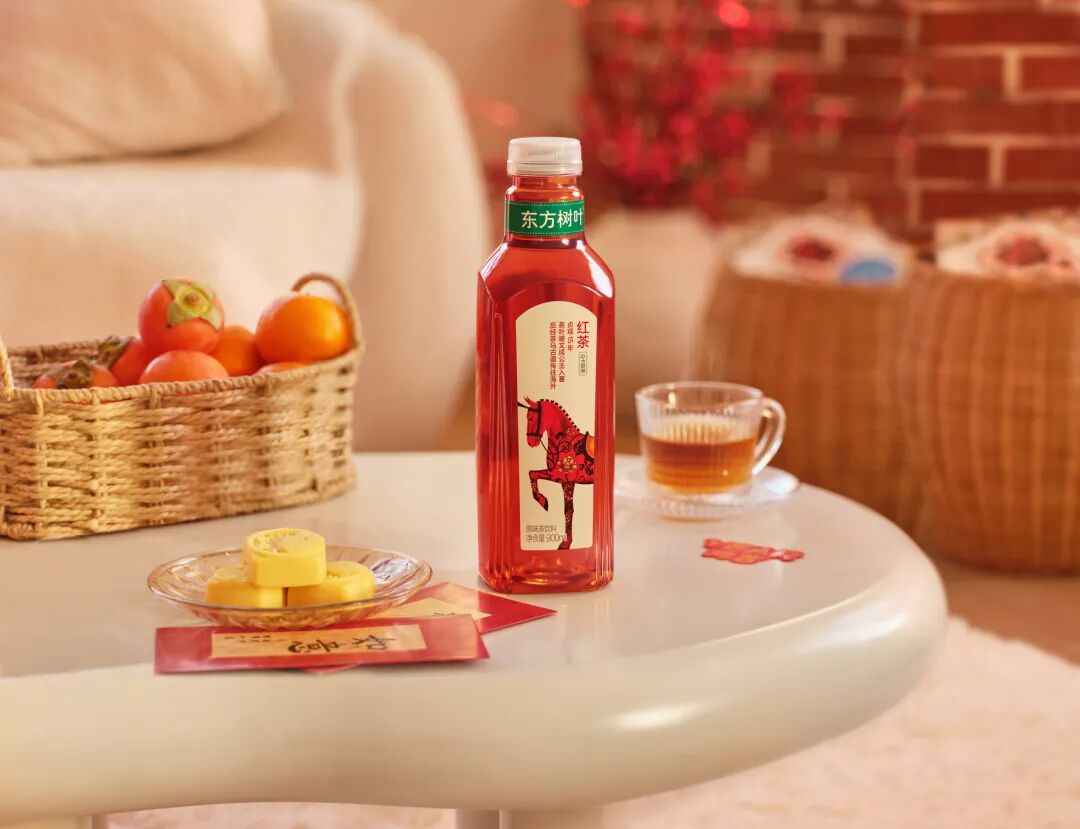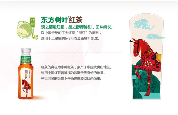 红茶是 2011 年东方树叶上市之初首推的四款茶品之一,彼时红马的形象就已经确立下来,十余年不曾更改。它的形象灵感取材于历史悠久的茶马古道。红茶包装上写着它的来历,“贞观 15 年,茶叶随文成公主入蕃,后经茶马古道传往海外。”