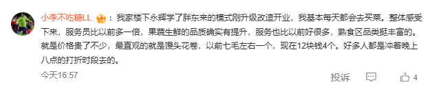 小李不吃糖LL:"我家楼下永辉学了胖东来的模式刚升级改造开业...服务员比以前多一倍,果蔬生鲜的品质确实有提升...就是价格贵了不少,最直观的就是馒头花卷,以前七毛左右一个,现在12块钱4个。"