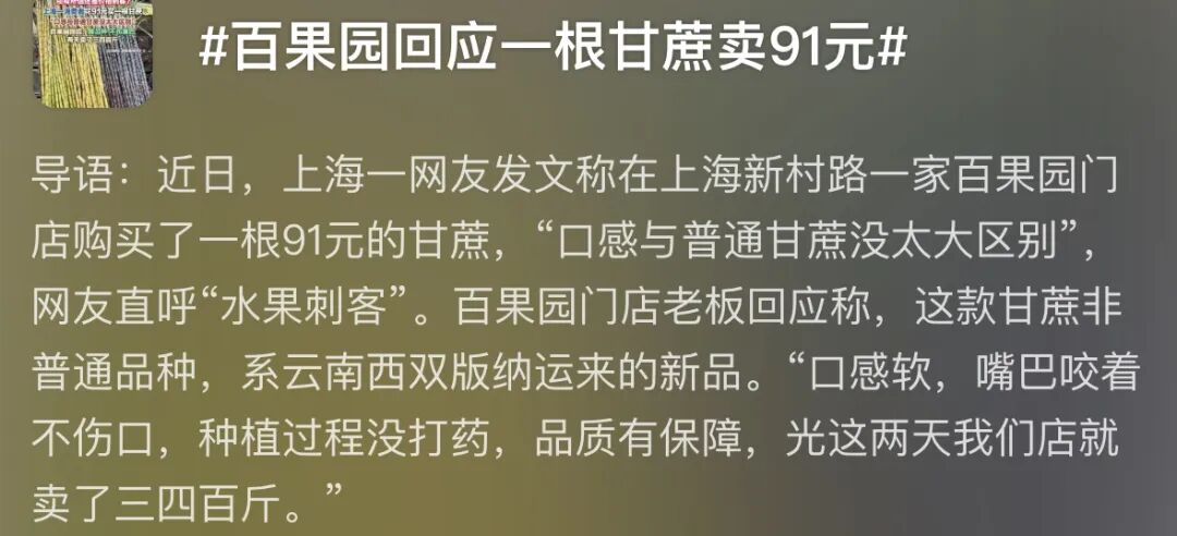 大概是有网友吐槽,上海一网友发文称,一家百果园门店购买了一根91元的甘蔗,「口感与普通甘蔗没太大区别」。