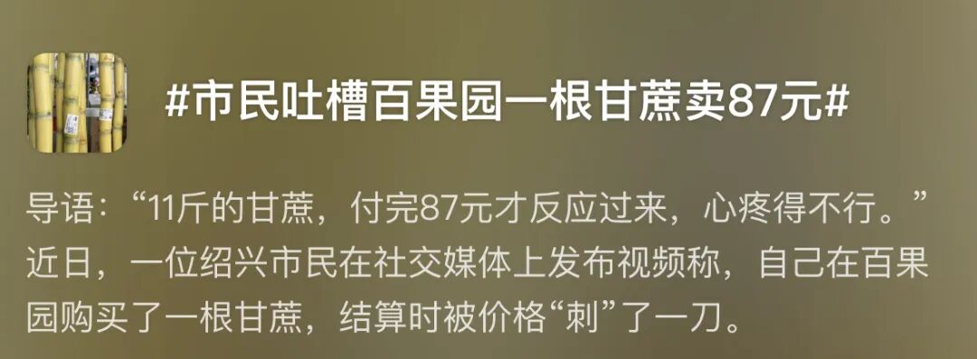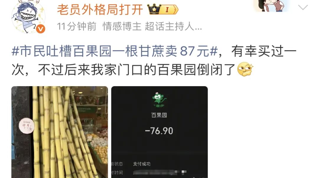 百果园又双叒叕因为贵被吐槽上了热搜——市民吐槽百果园一根甘蔗卖87元。
