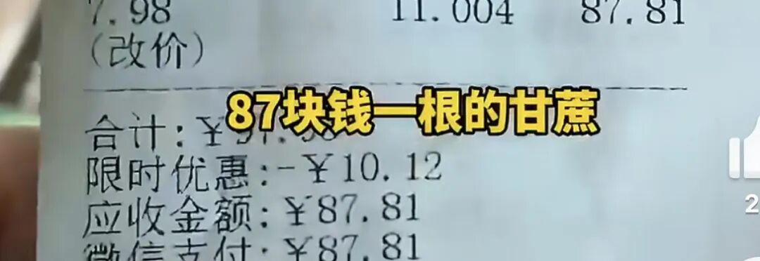 据了解,这根甘蔗重11斤,结账时发现价格高达87元。该消费者表示,付完钱才反应过来,心疼的不行。
