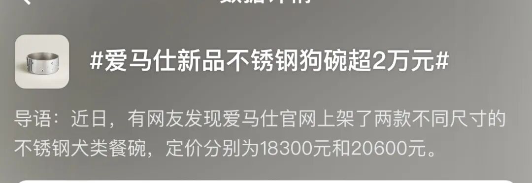 比如前不久冲上热搜的一个话题,——爱马仕新品不锈钢狗碗售价超2万……
