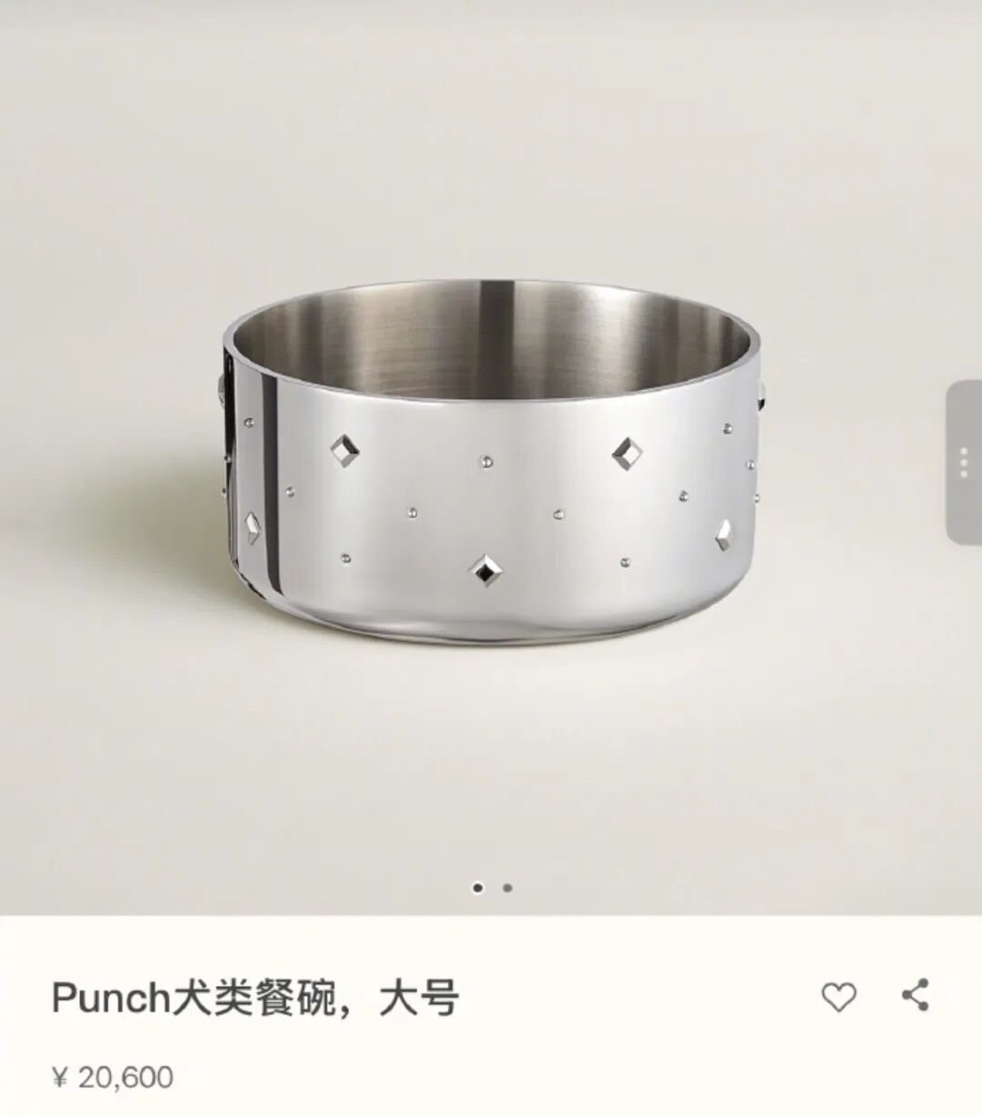 据了解,去年底,爱马仕官网上架了两款不同尺寸的不锈钢犬类餐碗,定价分别为18300元和20600元。