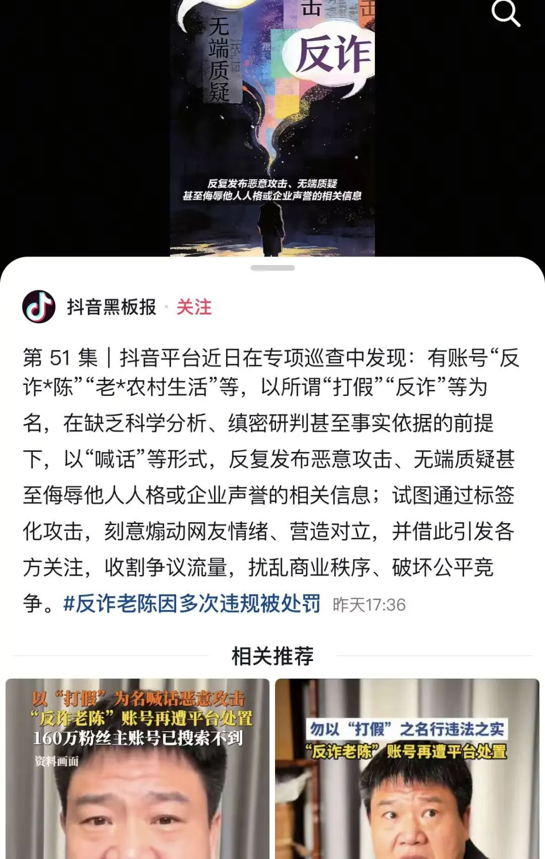 反诈老陈这几年,在社交媒体上凭借打假,吸引大量粉丝群体,然而,不少网友发现,近日,反诈老陈的账号已在抖音上搜索不到,疑似被封禁,该事件快速引发热议。随后,抖音黑板报发布说明称,抖音平台近日在专项巡查中发现,有账号“反诈*陈”“老*农村生活”等,以所谓“打假”“反诈”等为名,在缺乏科学分析、缜密研判甚至事实依据的前提下,以“喊话”等形式,反复发布恶意攻击、无端质疑。甚至发布侮辱他人人格或企业声誉的相关信息,试图通过标签化攻击,刻意煽动网友情绪、营造对立,并借此引发各方关注,收割争议流量,扰乱商业秩序、破坏公平竞争。