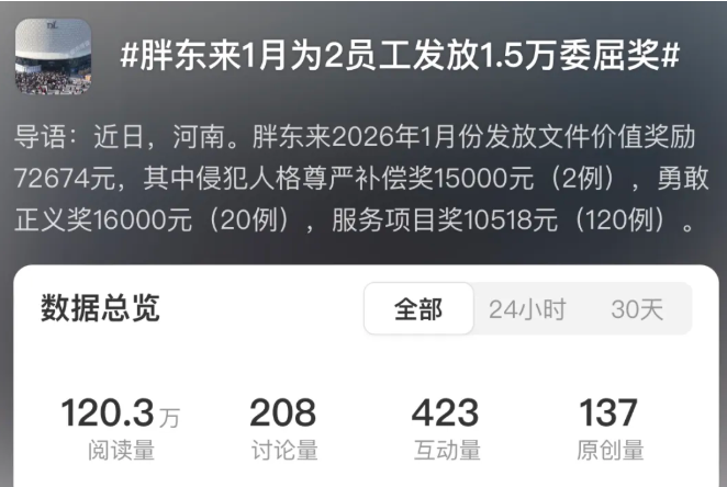 店长级月薪可达7.8万元,管理层及技术人员年人均分配约70万元,店长助理一个月也有接近五万……当然,高薪就算了,胖东来的员工福利,那更是整个职场的天花板,年休假不低于40天,未来计划延长至每月休班6天(即全年约180天),在年假之外,还有什么每年的十天不开心假。而他们每周工作的时间,不会超过36小时,按照双休来算,人家每天只要工作七小时,加班什么根本不存在的。除此之外,还有岗位补贴、节日福利、关怀福利(结婚贺金500-3000,生育贺金、见义勇为奖……),甚至还有委屈奖。比如前几天冲上热搜的话题,胖东来1月给2名员工发放1.5万委屈奖,据了解,这个委屈奖,无故指责赔5,000元以上,辱骂赔1万元以上,肢体冲突赔3万元以上。2025年全年该奖项累计发放39.2万元,涉及33起案例。