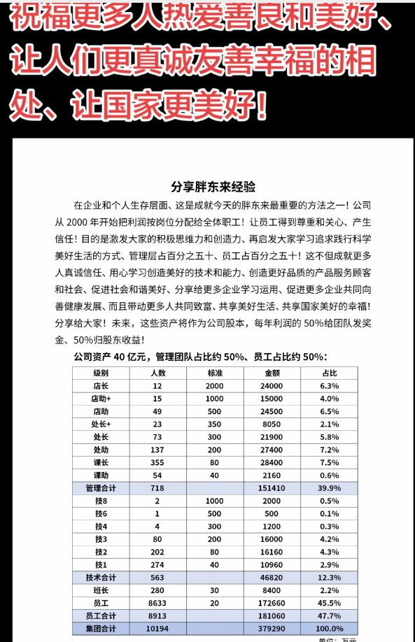 这份经验文件内容表示,在企业和个人生存层面、这是成就今天的胖东来最重要的方法之一!公司从2000年开始把利润按岗位分配给全体职工!“未来,这些资产将作为公司股本,每年利润的50%给团队发奖金、50%归股东收益!公司资产40亿元,管理团队占比约50%、员工占比约50%……”细节显示,公司资产分配按照员工级别来分,店长12人,每人2000万,占总资产的6.3%、店助+和店助64人,店助+每人1000万、店助每人五百万,两者合计占总资产的10.5%。而管理层包括店长、店助、处长、处助、课长、课助总共718人,资产分配占比39.9%。此外,技术合计563人,资产分配占比12.3%,剩下的班长和员工共计8913人,班长每人30万,员工20万,共享18.1亿元资产,资产分配占比47.7%。披露信息显示,胖东来集团员工合计10194人,资产总额约37.93亿元。看到这一幕,打工人都是羡慕哭了。有人表示:东来哥我投简历了,但是没进去被刷掉了,好想做你的员工呀,不是具体工资的问题,是很认可你的善良和理念,您这里就像一片净土。