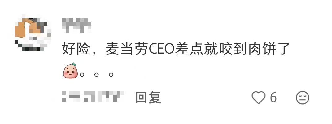 还有网友调侃道:“好险,麦当劳CEO差点就咬到肉饼了。”