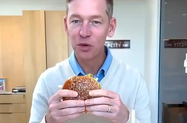 事件的起因很简单:近日,为了推广麦当劳史上尺寸最大的新品“大拱门”汉堡,这位CEO在个人社交平台发布了一段试吃视频。