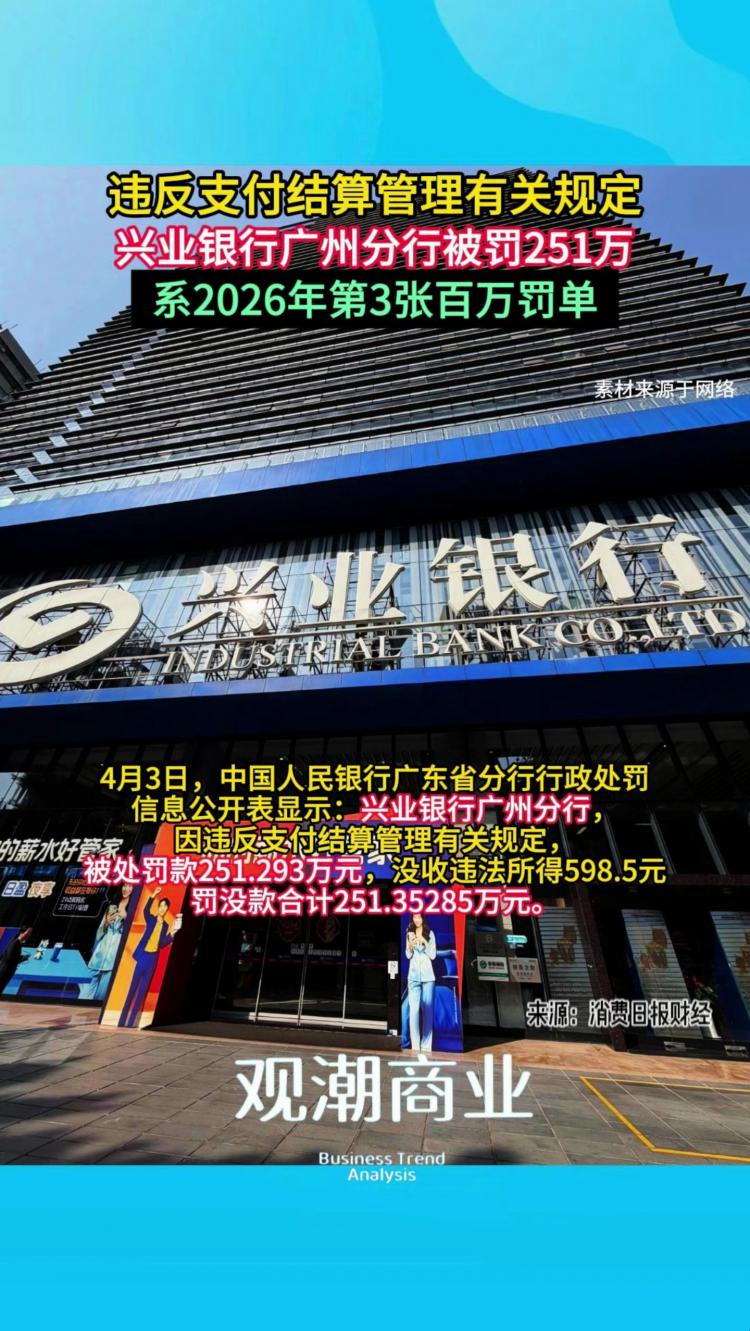 违反支付结算管理有关规定,兴业银行广州分行被罚251万元!系2026年第3张百万罚单