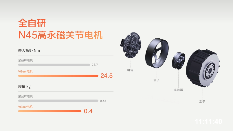 其核心动力来自 Vbot 全自研 N45 高永磁关节电机,峰值扭矩 24.5 Nm、重量仅 0.4kg,在轻量化的同时能保证强劲持久输出。