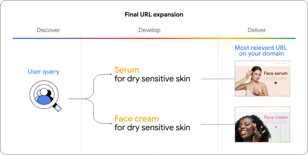 面对全球用户的花式提问,AI Max还会主动学习广告主的品牌素材,实时生成最能回应用户需求的广告文案,并通过“最终URL扩展功能”,自动匹配最相关的落地页,帮助品牌解锁更多生意机会。