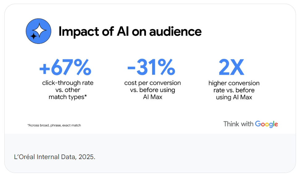 全球美妆巨头欧莱雅(L’Oréal)计划到2030年将其全球消费者群体从12.5亿增长到 20亿。为了达成这个目标,品牌希望借助搜索触达更多用户,而AI Max也被集团内部视为关键的增长引擎。