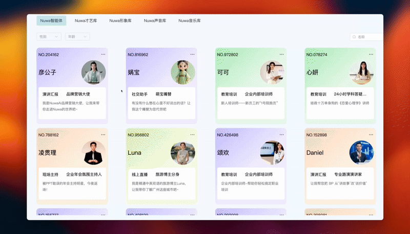 除了自己生成,NuwaAI已经为咱准备好了相当丰富的数字人资源。
