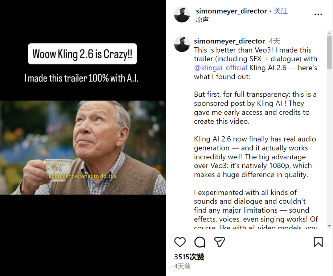这一表述来自海外视频博主Simon Meyers,在分享中,他使用可灵2.6制作了一则预告片,并用各种复杂的提示词来测试模型功能: