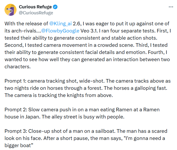 另一视频博主Curious Refuge选择用新的方式测试可灵2.6——用四组画面和生成词,分别交给Veo3.1和可灵2.6,分别是俯拍镜头,两位骑士骑马穿越森林;推镜头,食客在面馆吃拉面;特写镜头,男子在帆船上独白;固定中景镜头,男子吃掉饼干,并与宠物狗交流。